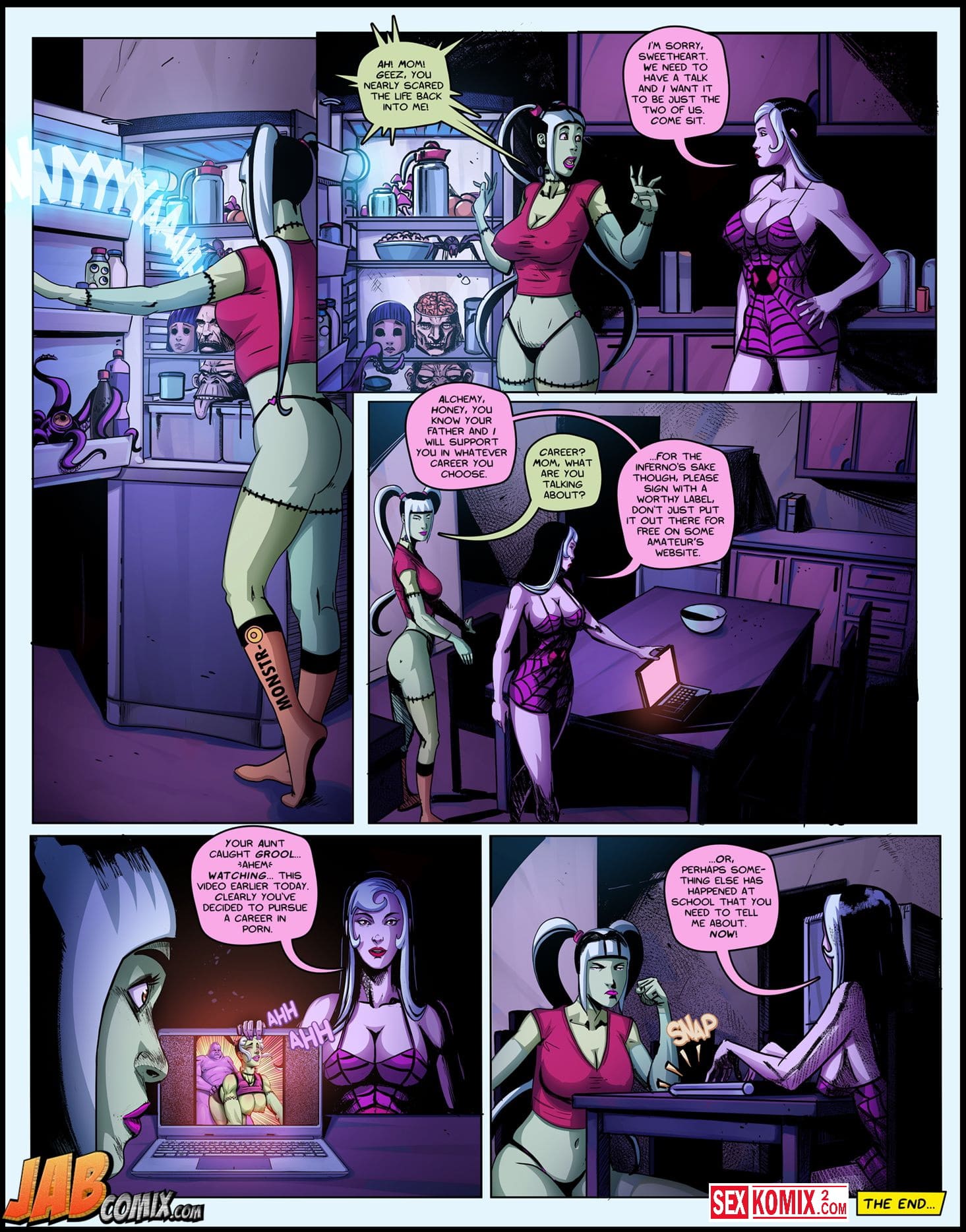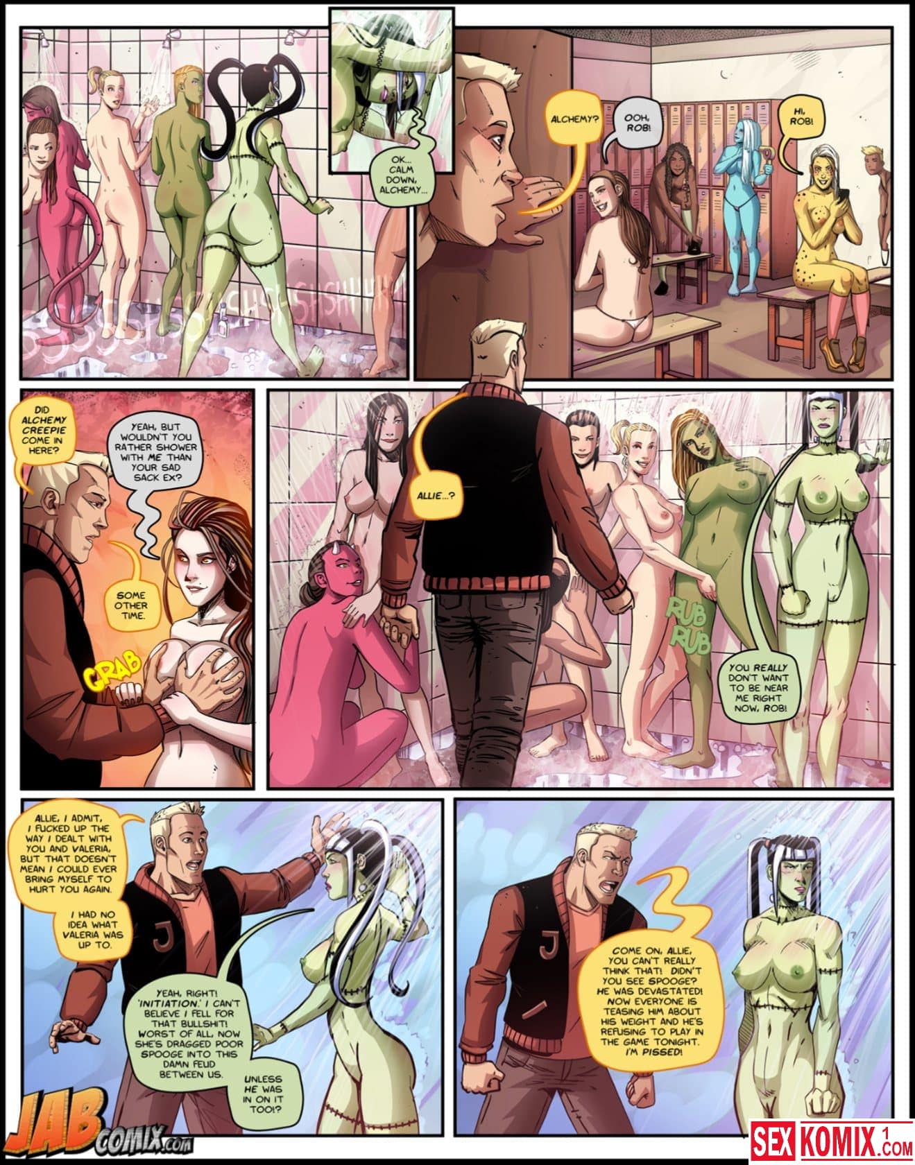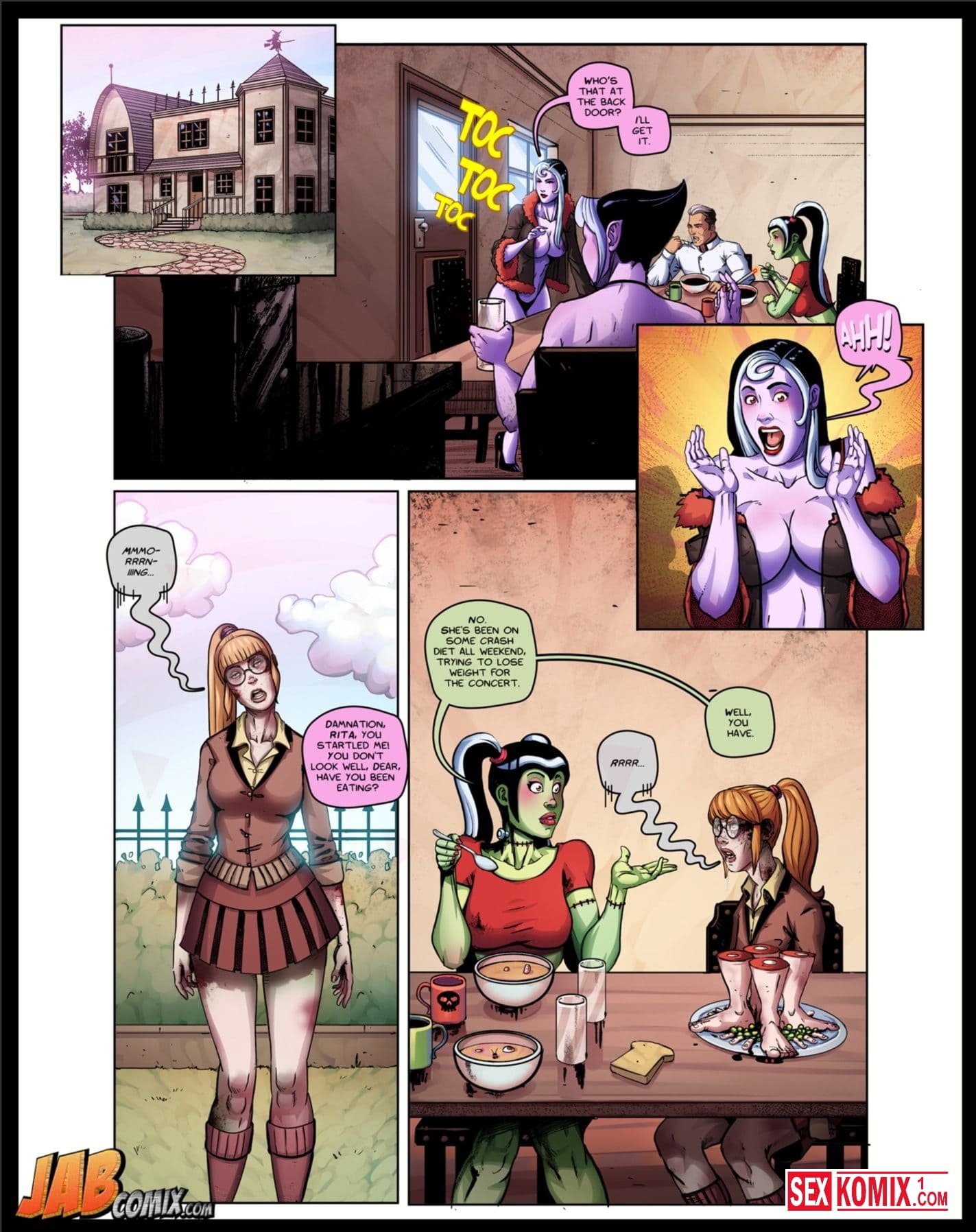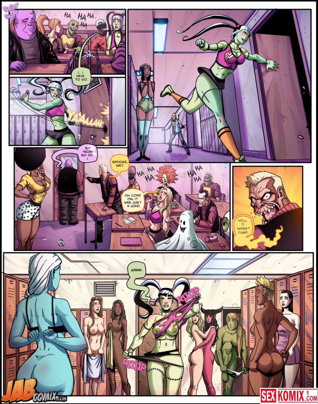 Обновлен. Порно комиксы The Creepies. Часть 5. У всех девушек развратная подружка, которая трахается со всеми подряд. А в семье монстров такая же, она уже с утра думает, кто даст себя сегодня трахнуть. Вечером, после тренировки, огромный парень входит в раздевалку и предлагает ей трахаться. Девушка конечно согласна.