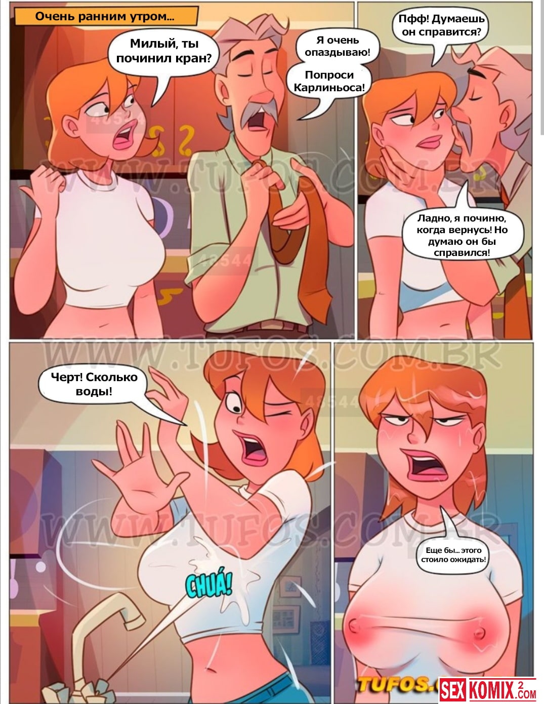 Порно комикс Похотливая семейка. Часть 83. Обмен. Муж второпях собрался на работу и ушёл, жена не успела сказать о сломанном кране. Она пошла мыть посуду и вся облилась, через мокрую футболку были видны соски, но женщина этого не заметила и пошла просить о помощи соседа. Парень увидел большие сиськи своей соседки и сразу же пошел помогать, в надежде увидеть больше.