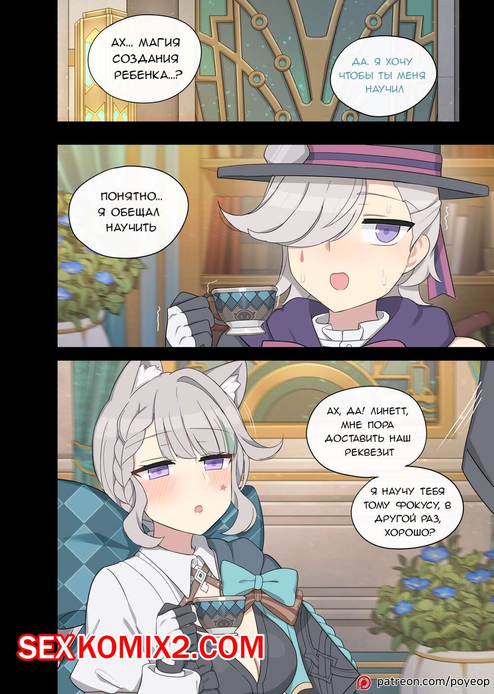 Порно комикс Genshin Impact. Линетт. Lynette. Poyeop Парень был очень возбужден и хотел трахнуть сексуальную блондинку. Он дал ей вдохнуть афродизиак, после чего девушка отсосала большой хуй парня и дала ему себя выебать.