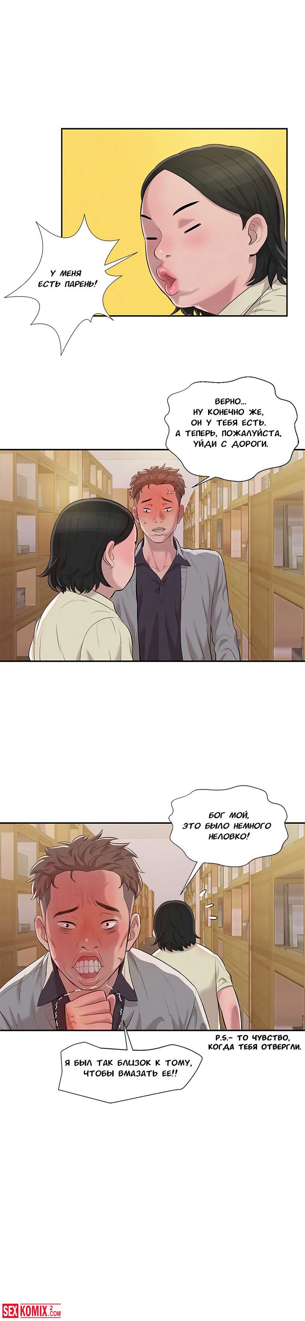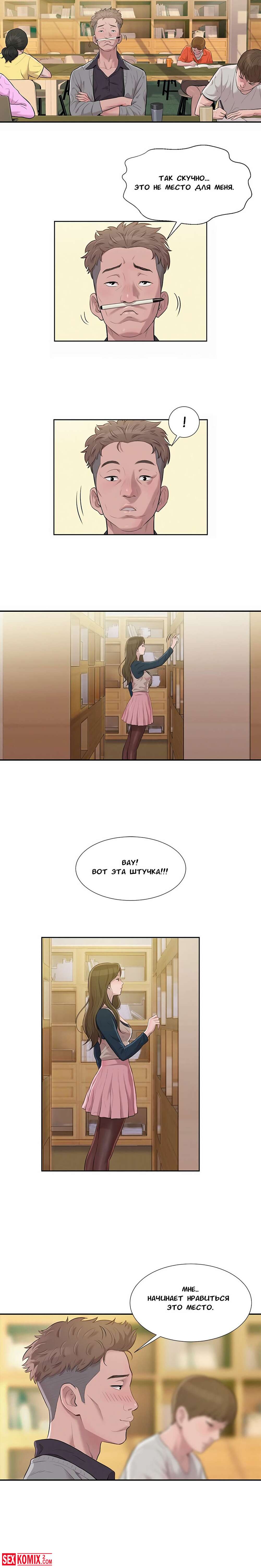 Порно комикс Первокурсник. Части 3 и 4. Студент в библиотеке попал во внимание учительницы, женщина сделала минет парню и умаляла её трахнуть.