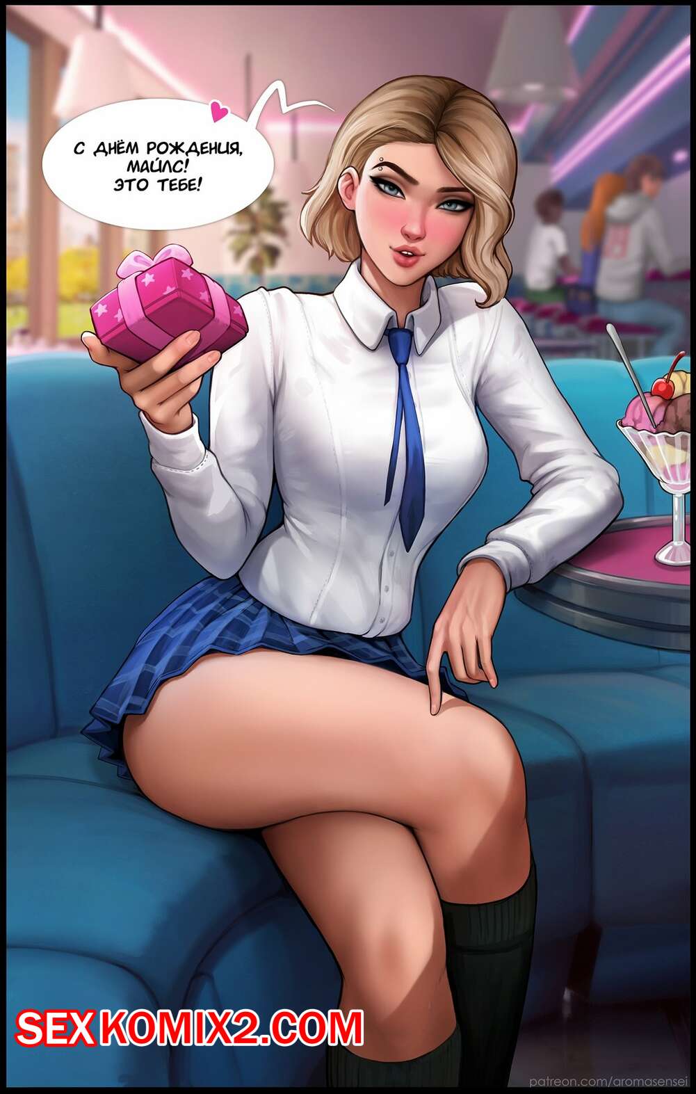 Порно комикс Гвен. День рождения Маилза. Горячая блондинка приготовила своему другу подарок на день рождения. Она сняла его штаны и начала делать сочный минет.