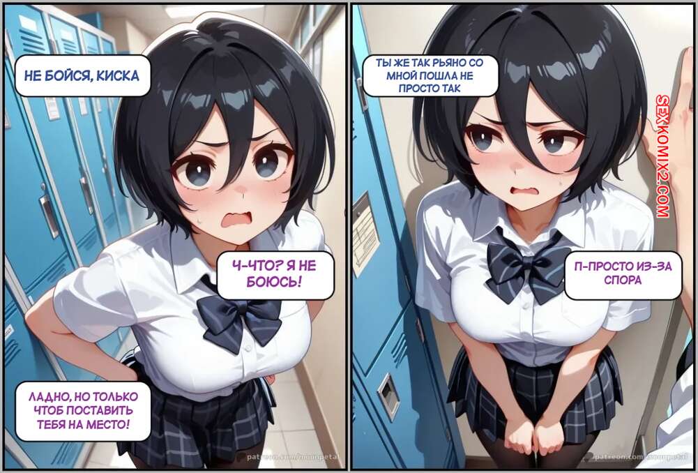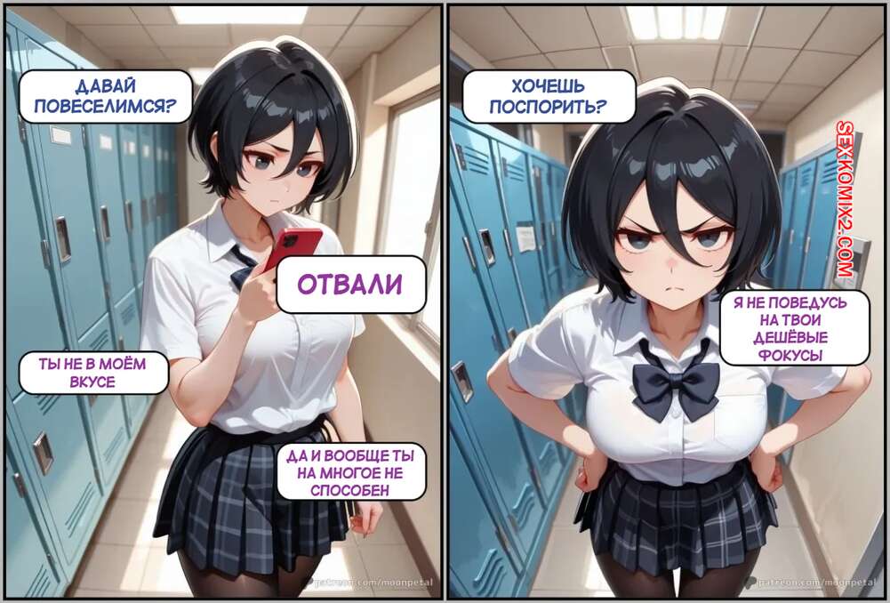 Порно комикс Хочешь поспорить. Часть 1. Wanna Make a Bet. Moon Petal Горячая брюнетка уединилась с парнем в раздевалке, чтобы пошалить. Девушка встала на колени и стала сосать большой хуй парня, после чего встала раком и дала себя трахнуть.