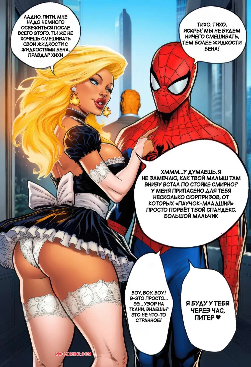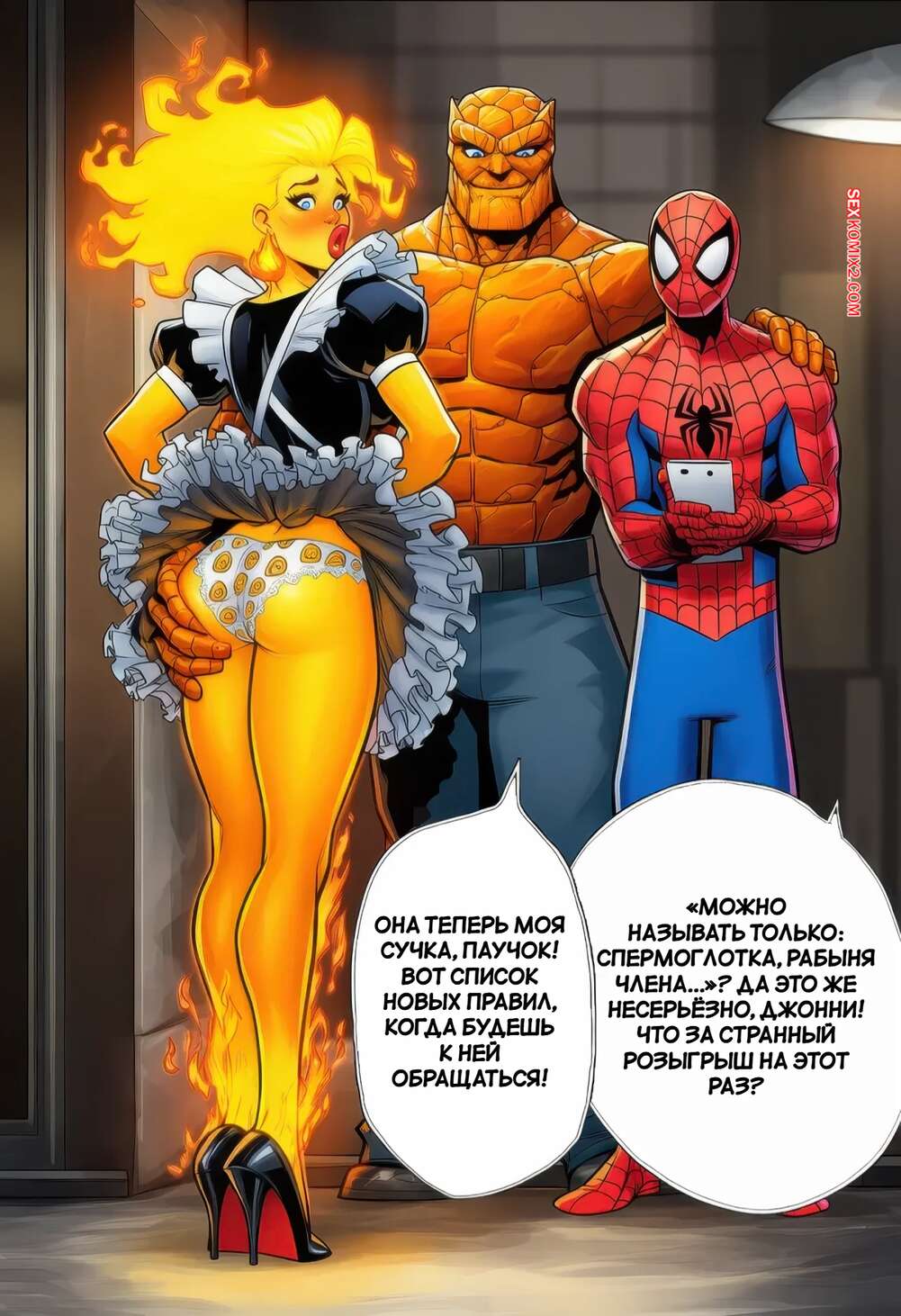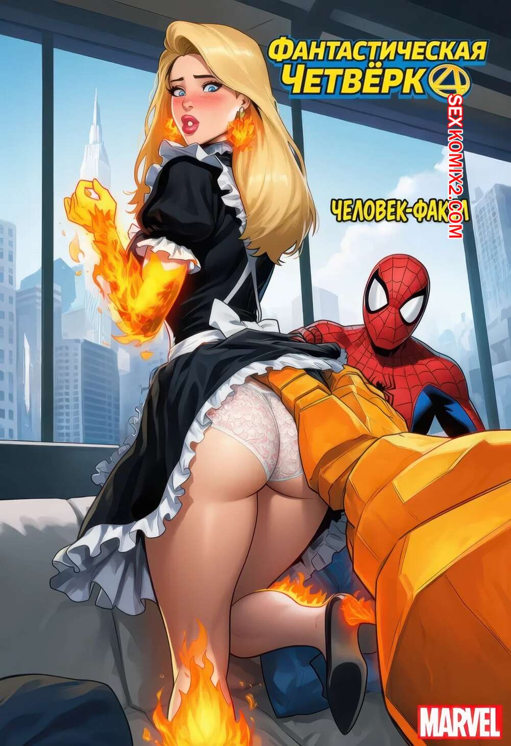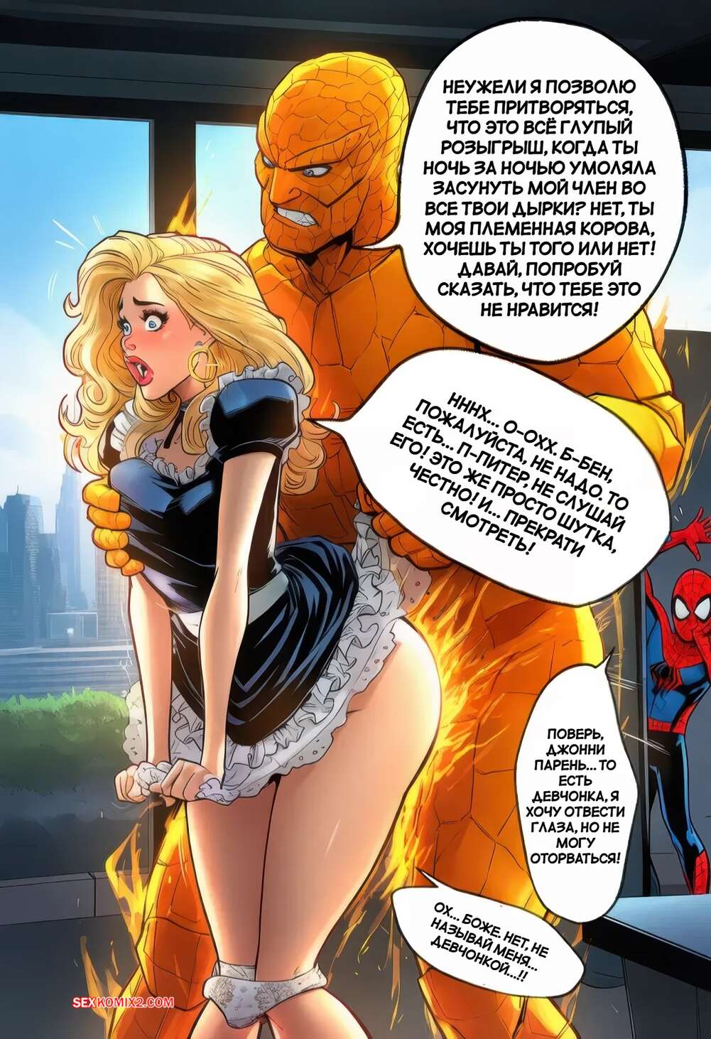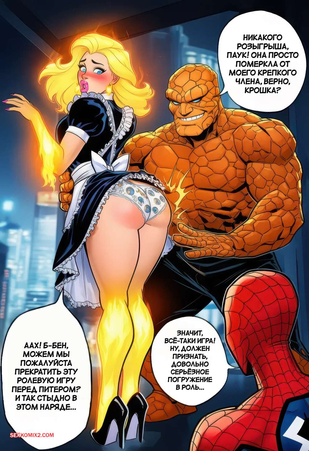 Порно комикс Фантастическая четверка. Человек Факел. The Human Torch. PrincessJupiterTG Человек Факел превратился в горячую блондинку и Существо решает воспользоваться случаем. Он шлепает красотку и возбуждает ее, после чего ебет ее пизду своим большим членом.