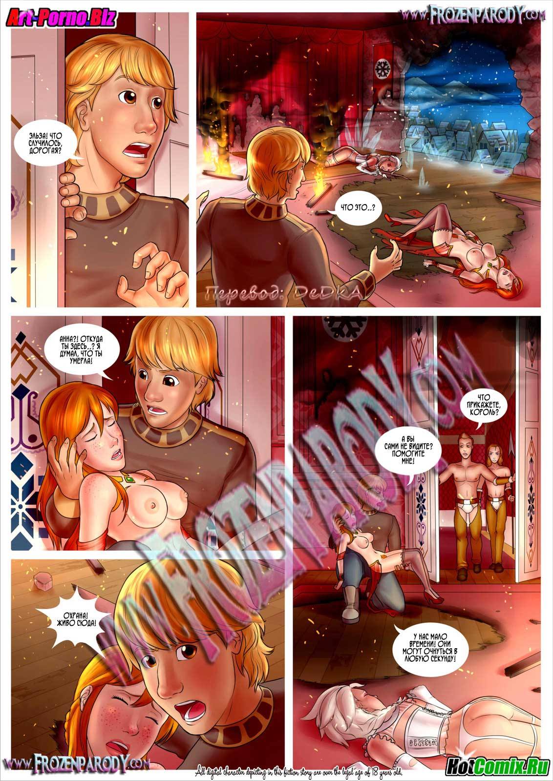 Порно комиксы лесби. Холодное сердце. Часть 4. Снежная королева соблазнила мужа своей подруги, огненной волшебницы. И занялась с ним горячим сексом, но слуги из дворца рассказали об измене. И разъяренная повелительница огня ворвалась в покои королевы и напала на неё, завязалась битва двух стихий. Девушки не уступали друг другу и бой их измотал, они упали на пол. Осознав, что это было очень глупо девушки сблизились и занялись сексом в примирение. В самом разгаре лесбиянской утехи в комнату ворвался муж огненной волшебницы, он хотел их померить, но девушки уже сами всё решили.