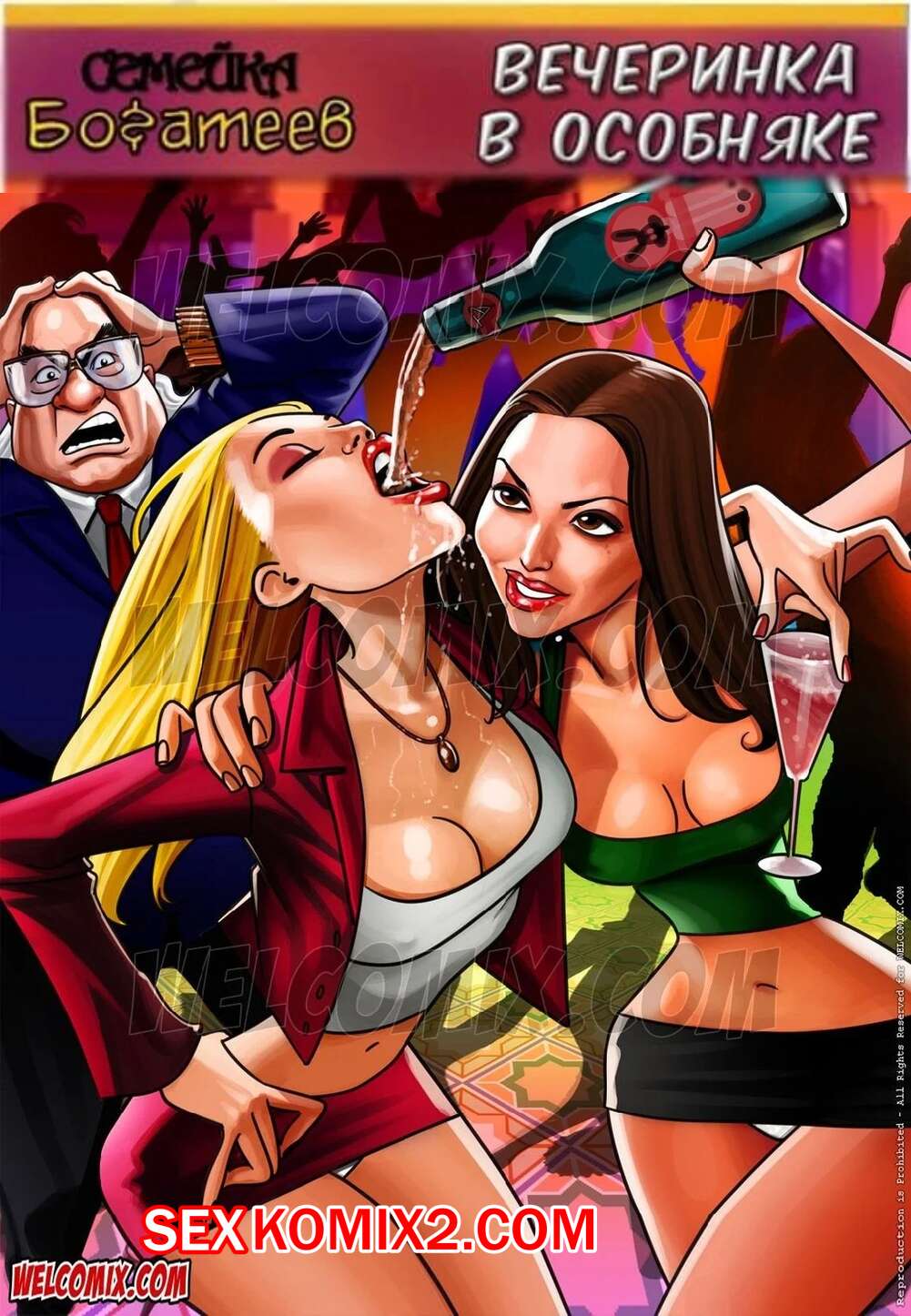 Порно комикс Семейка богатеев. Часть 2. Вечеринка в особняке Батя вернулся домой и спалил, что его сынок устроил там вечеринку. Он быстренько все закрыл и отправился на кухню, где веселились две молодые красотки, которые захотели потрахаться с опытным мужиком.